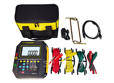 儀器由主機、測試線、輔助接地棒、數據軟件、通訊線等組成。主機采用一體化手持式設計,具有密度小、重量輕、強度、剛度、硬度、耐磨性、耐熱性、絕緣性能更優越,確保各種環境測試的高精度、高穩定性和高可靠性。主機超大LCD顯示,具有背光、棒圖指示,一目了然,能存儲300組數據,通過數據軟件可以實現歷史數據讀取、查閱、保存、報表、打印等功能。